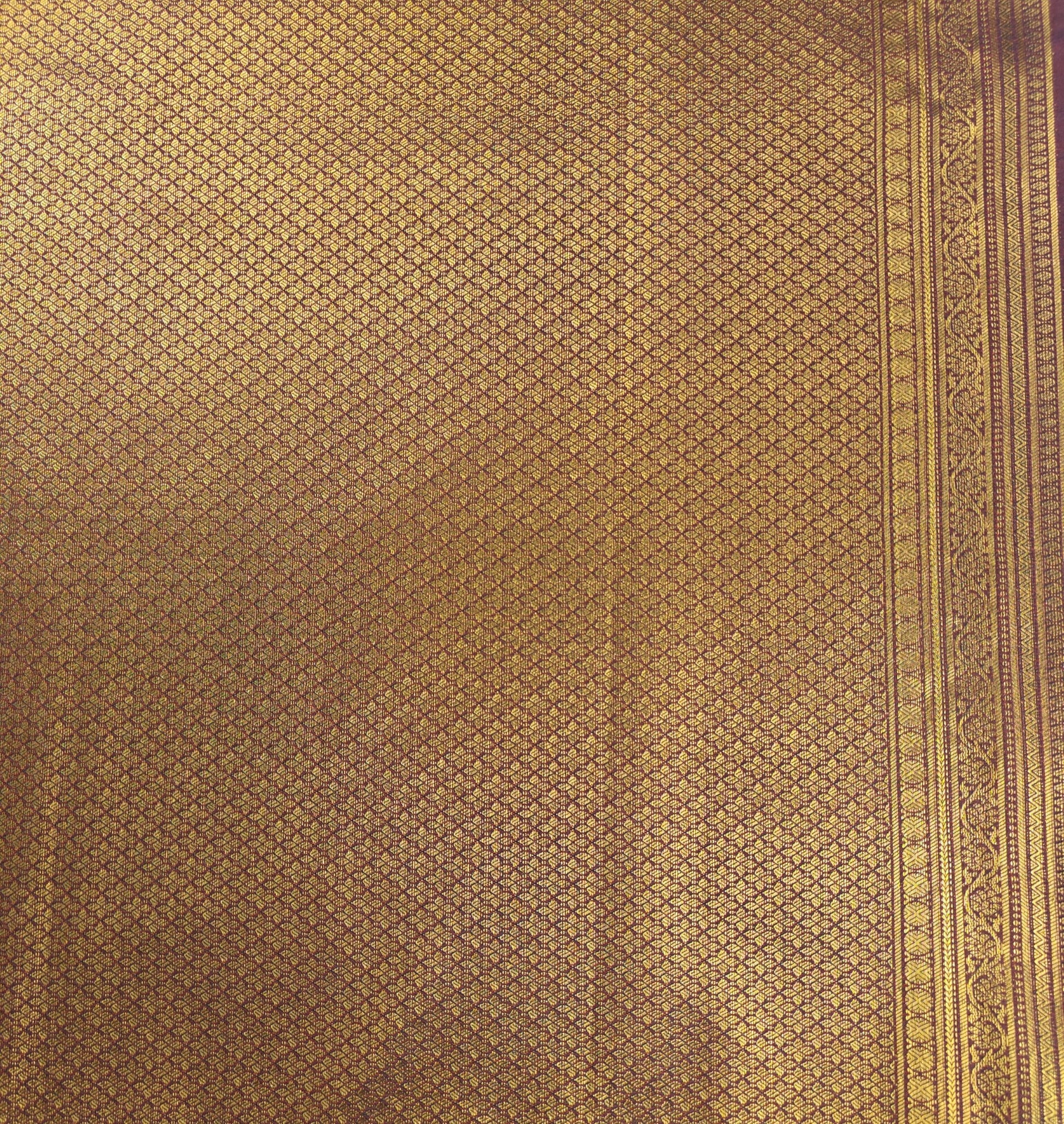 A classic saree with a checkered body and a rich woven contrasting broad border and intricately detailed pallu. It includes a contrasting self plain blouse.