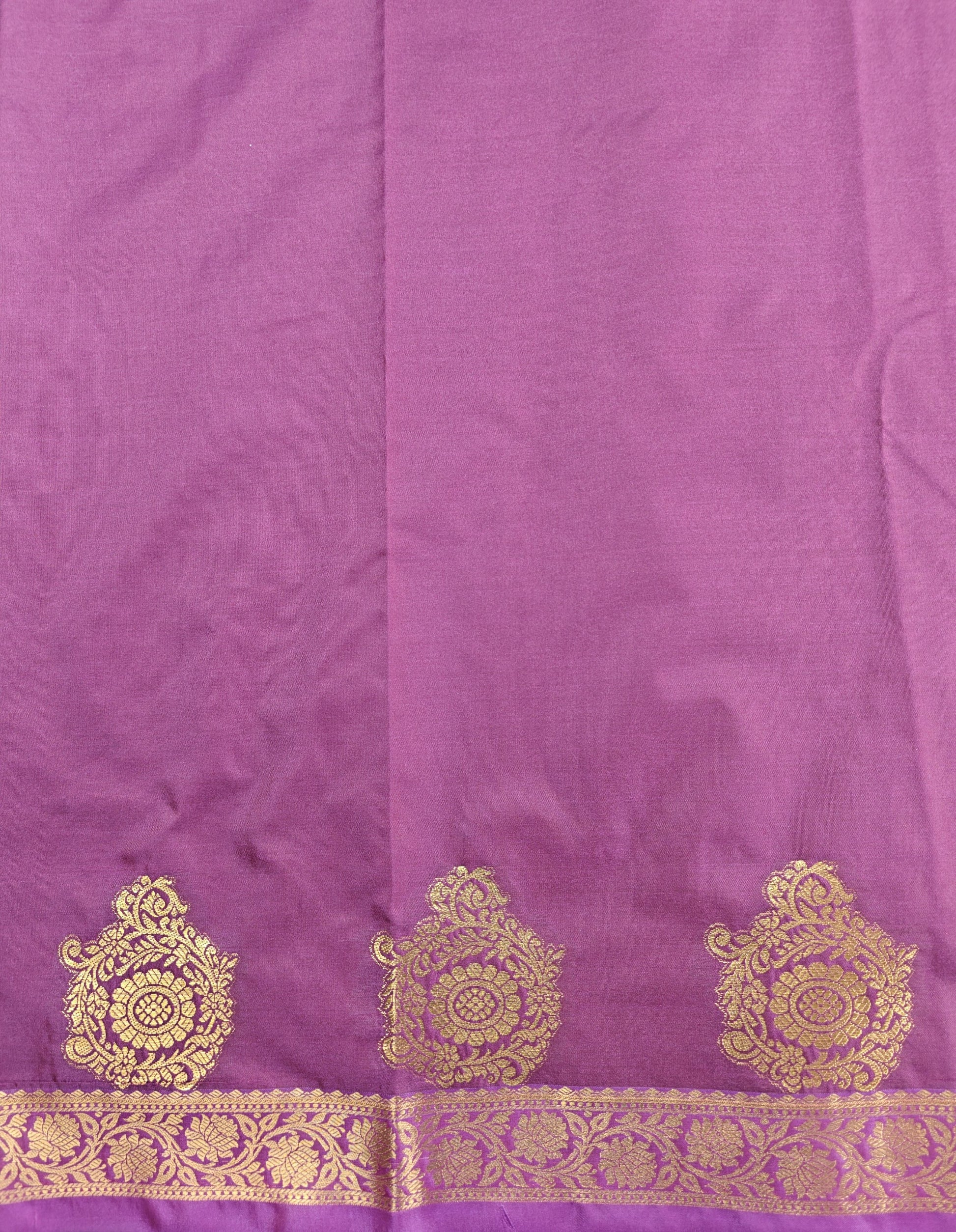 This stunning saree is adorned with ornate floral zari motifs and a highly detailed border and pallu. It includes a contrasting blouse with border.