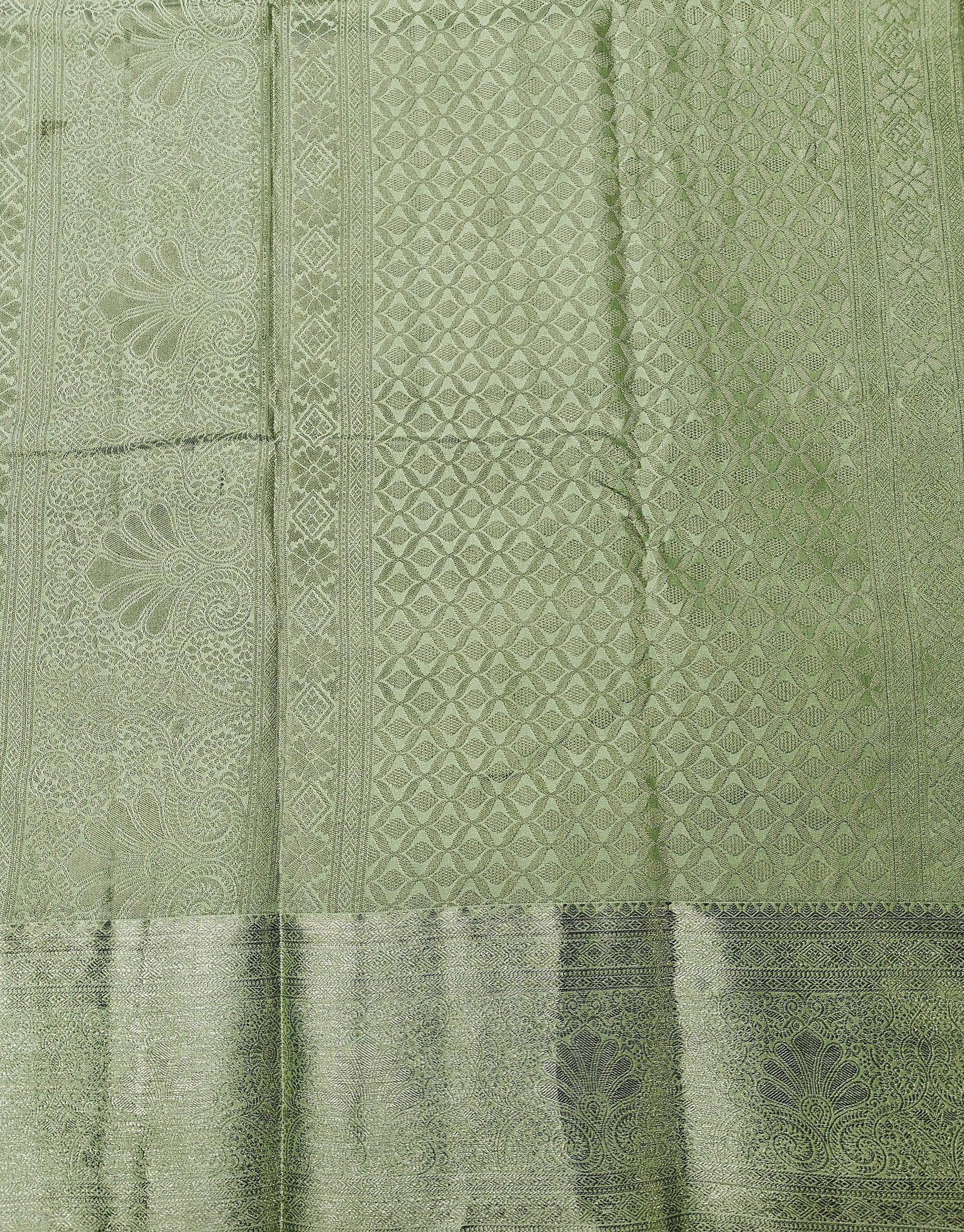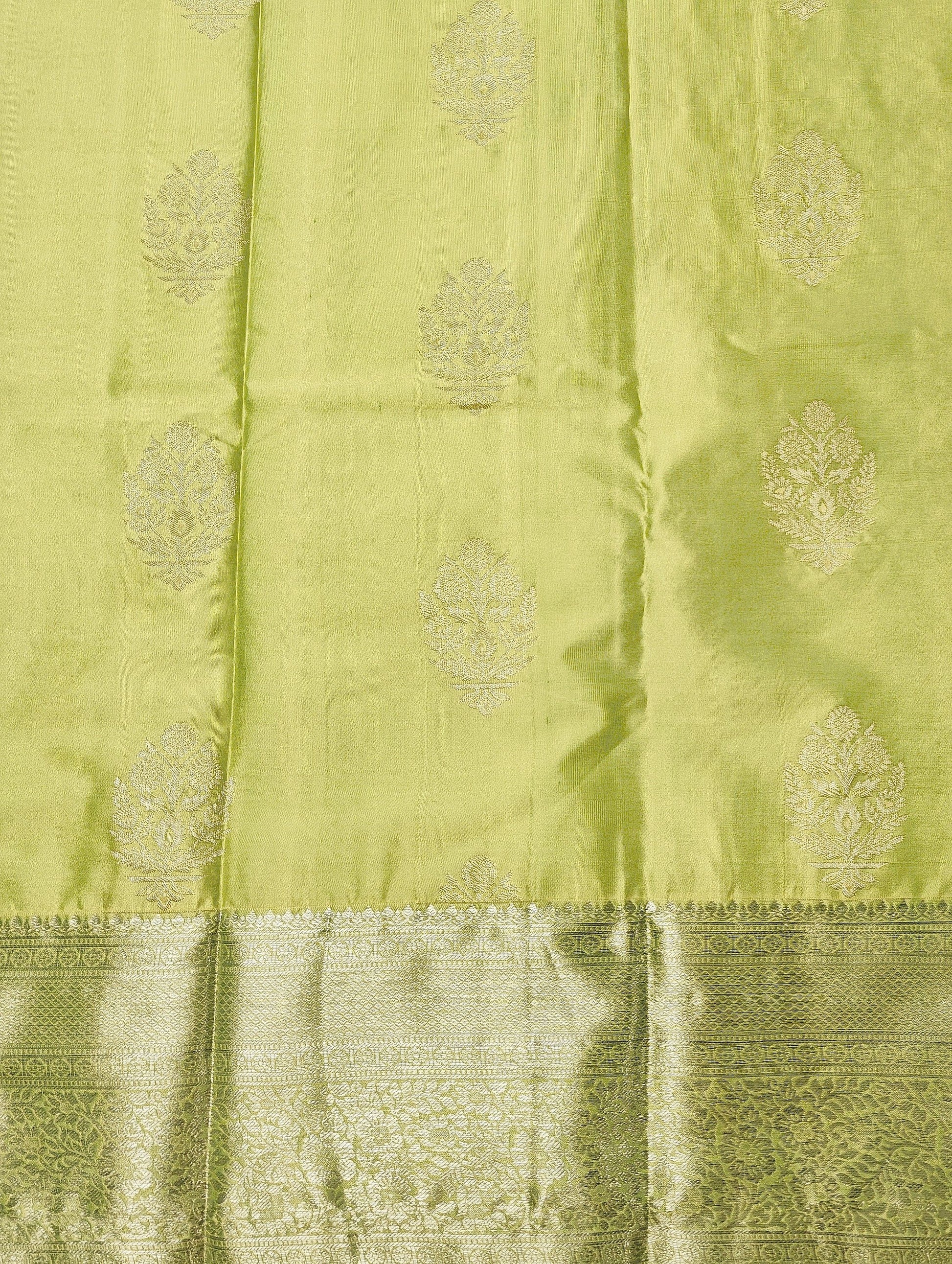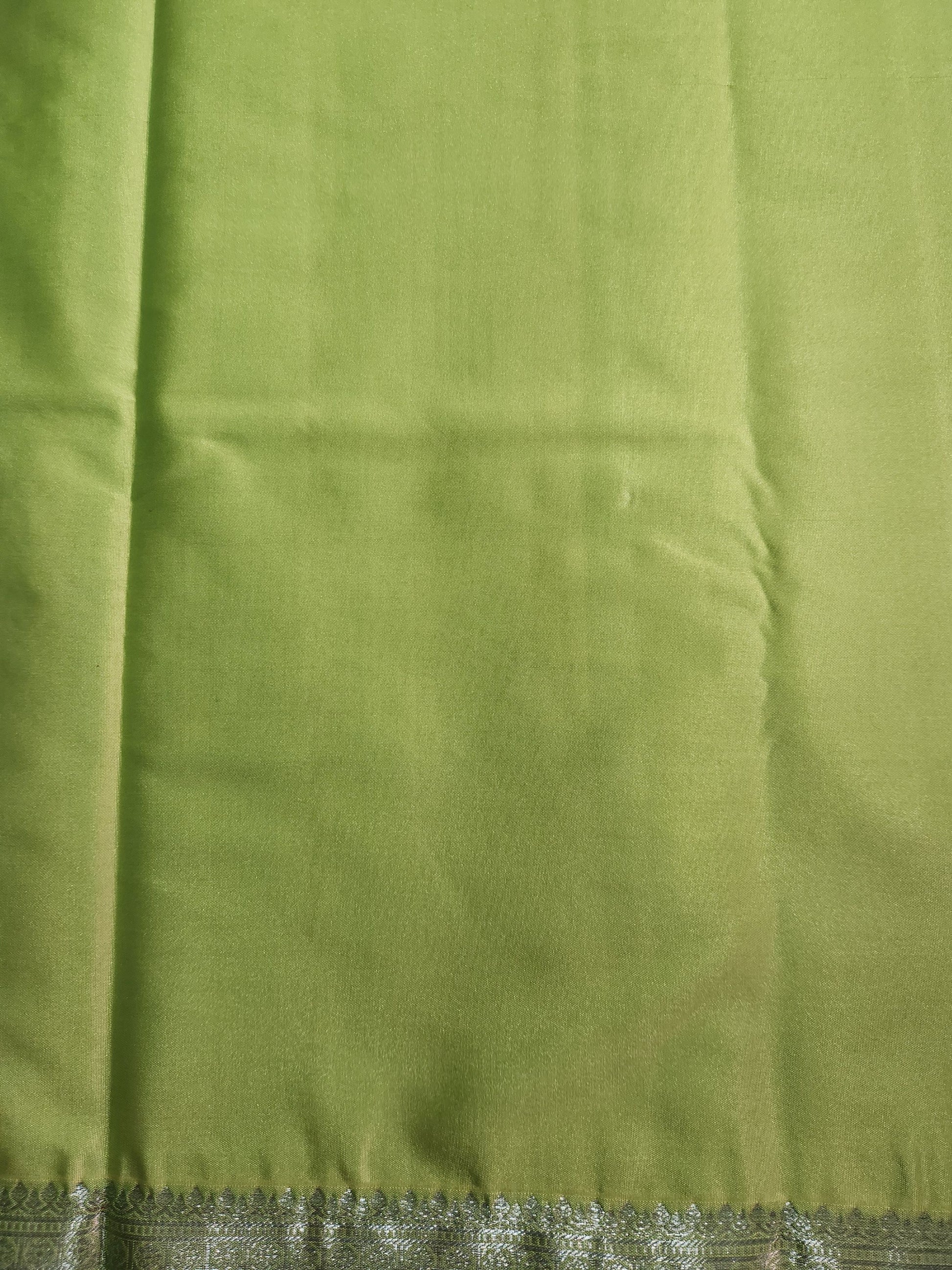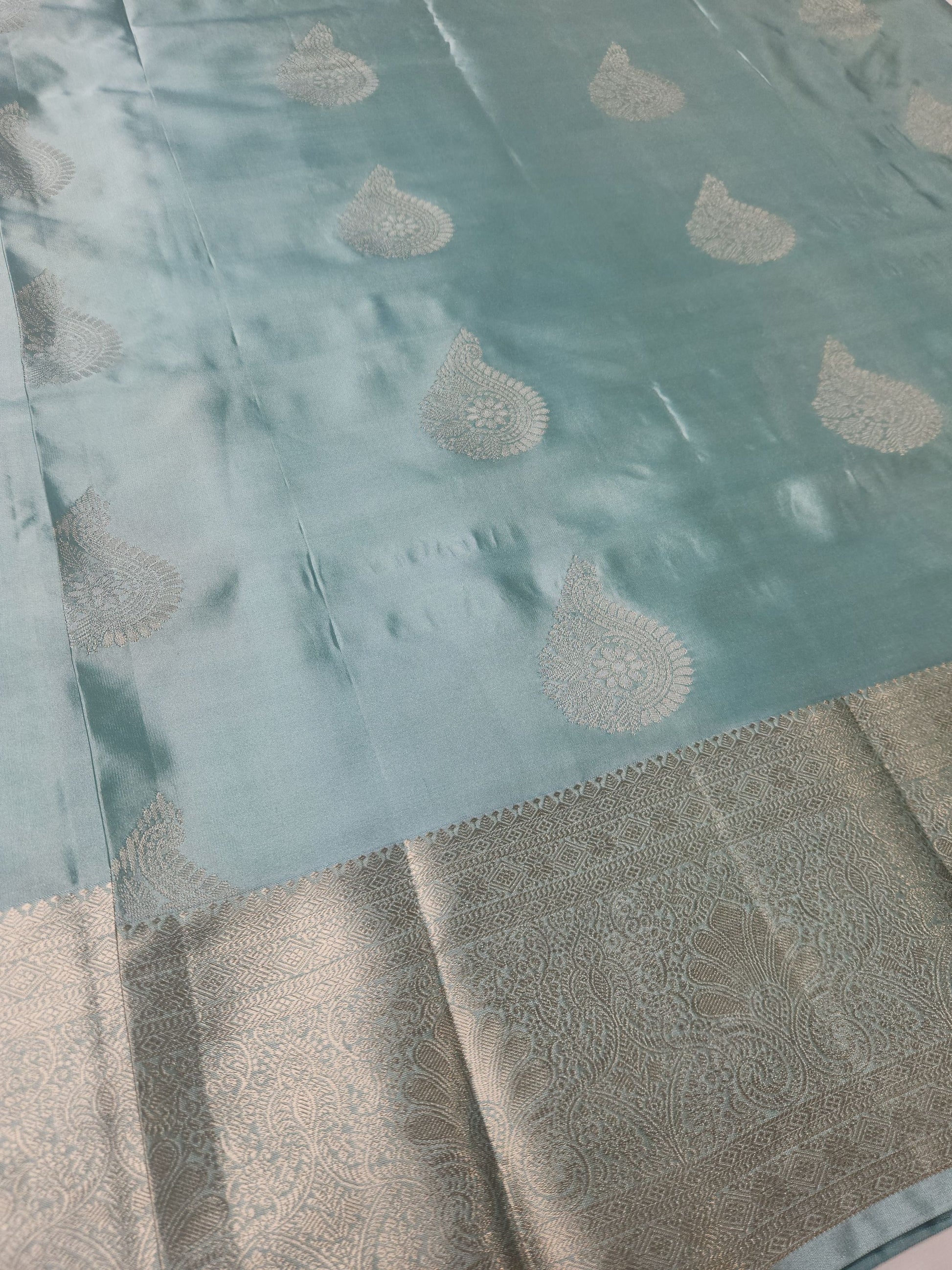 This elegant saree is a blend of traditional motifs and meticulous weaving, it's adorned with elegant paisley motifs all across the body. It had an intricately carved border that is rich and highly detailed. It comes with a self, grand pallu and a self blouse with border.