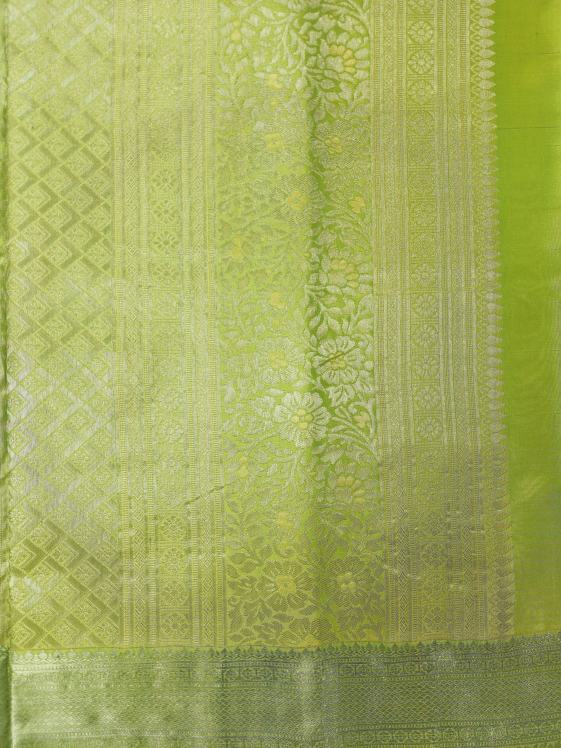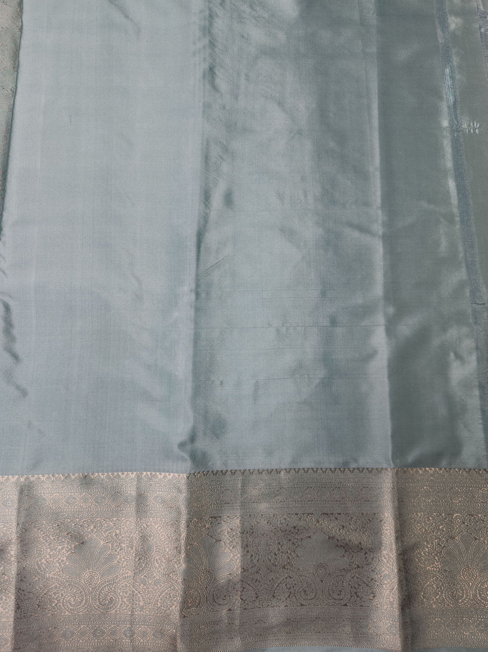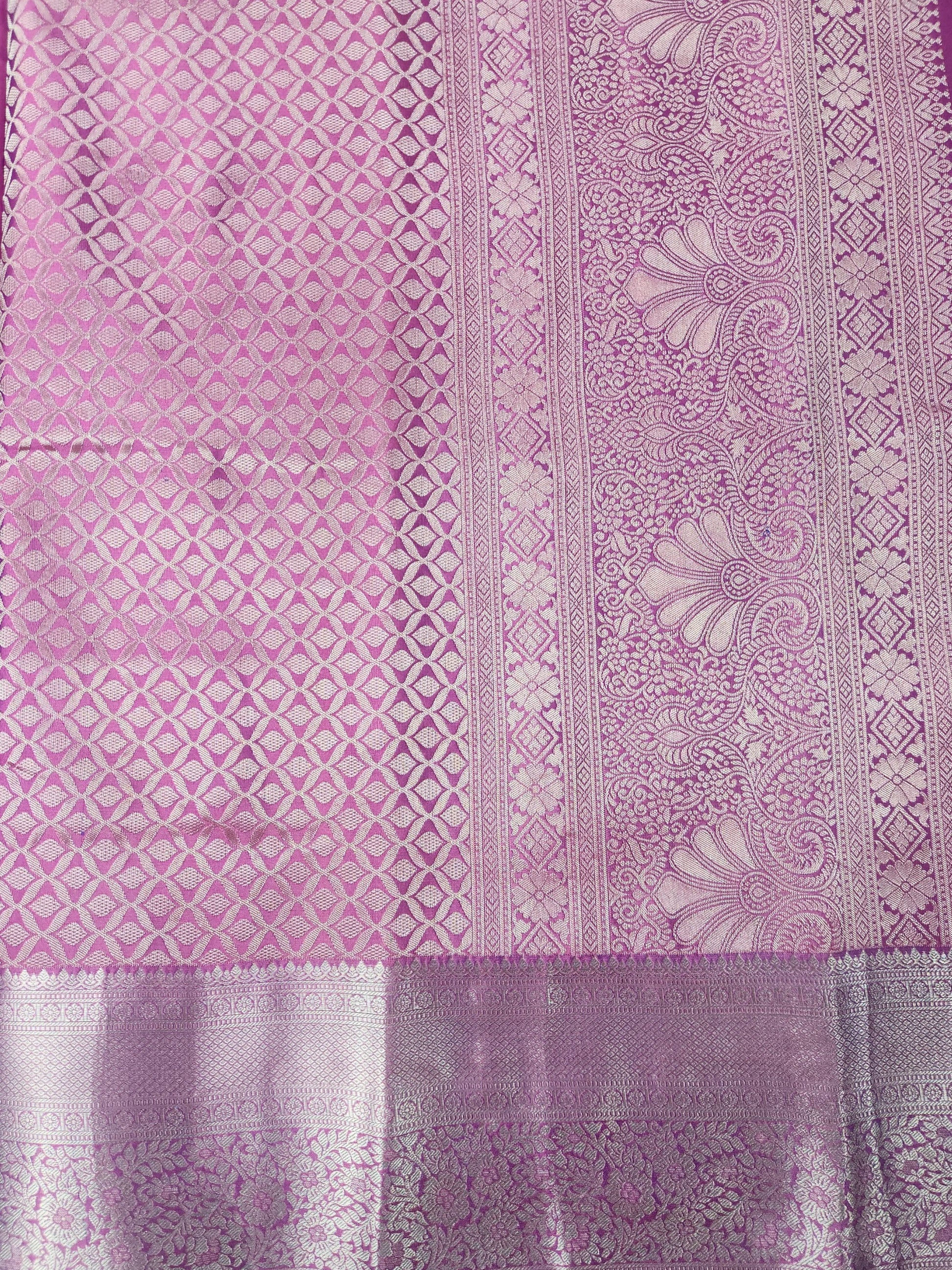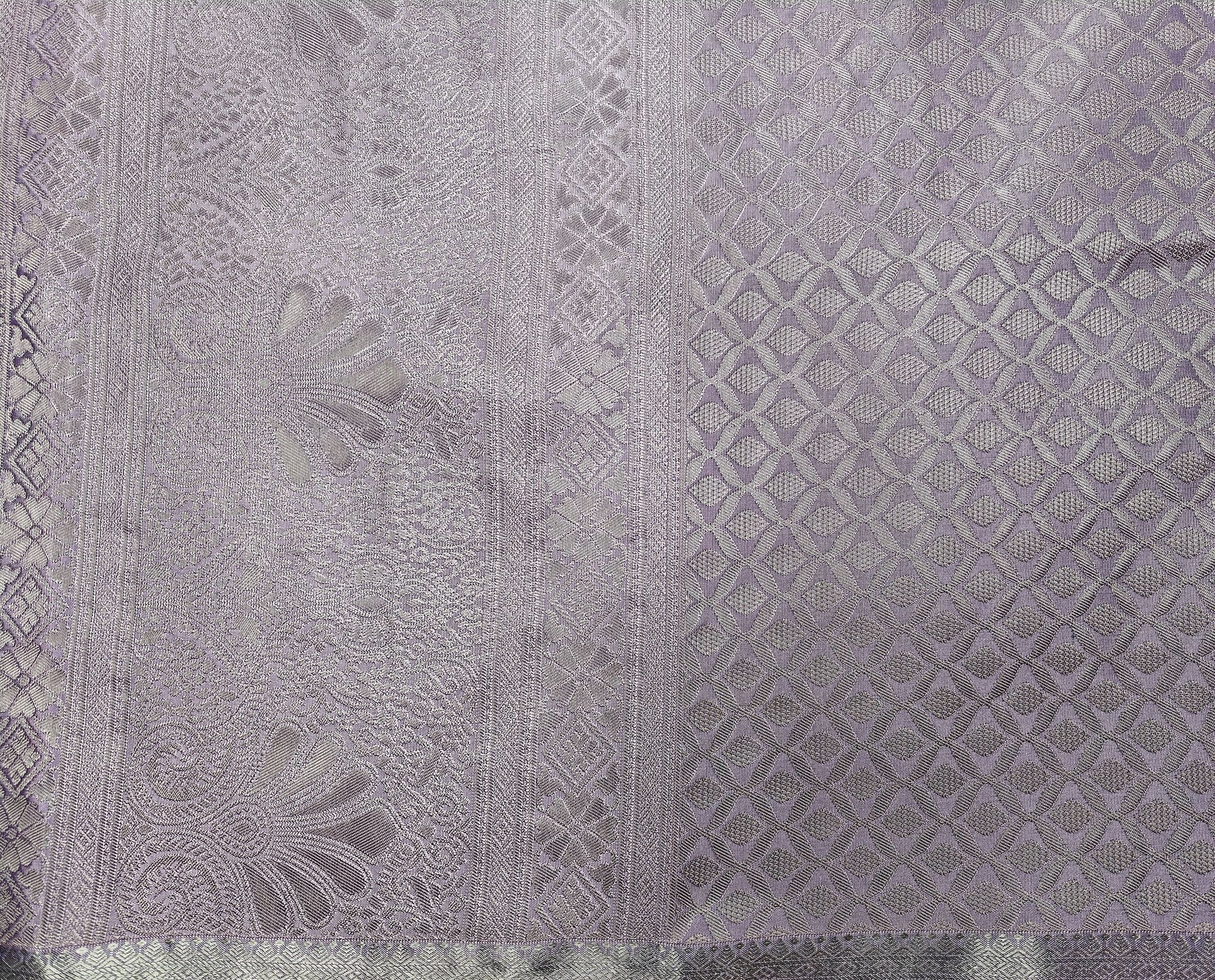 This elegant saree is a blend of traditional motifs and meticulous weaving, it's adorned with elegant paisley motifs all across the body. It had an intricately carved border that is rich and highly detailed. It comes with a self, grand pallu and a self blouse with border.